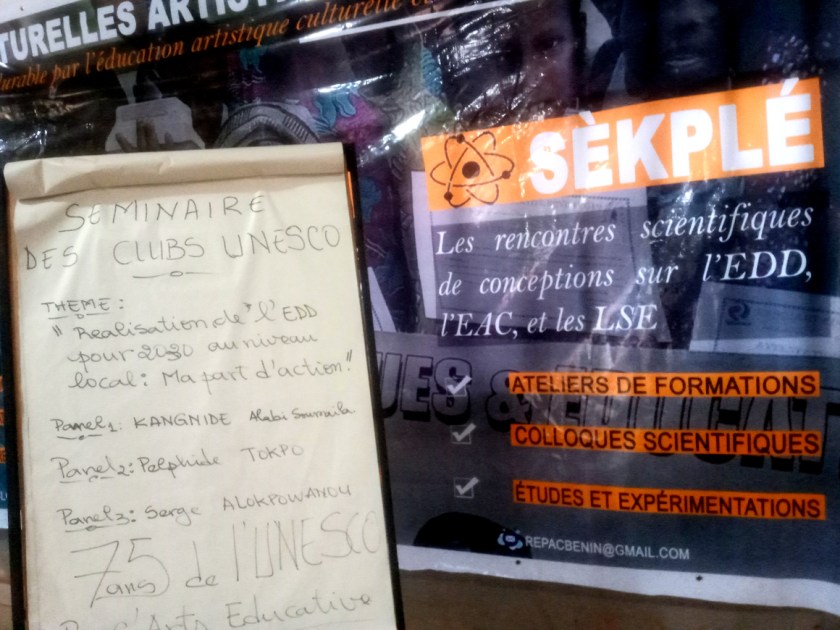 Après cela a été ouvert le bal des communications. Le premier panel intitulé le concept d’éducation au développement durable (EDD) selon l’UNESCO et son enjeu pour le développement local a été animé par M. Soumaila Alabi Kangnidé, Responsable des clubs Unesco d’Ifangni. S’en est suivi la communication de Monsieur Pelphide TOKPO sur le rôle des enseignant dans la réalisation de l’EDD au niveau local couronnée par celle de Serge ALOKPOWANOU administrateur socioculturel et président de l’ONG « La culture au Cœur du Développement » sur la place de la culture dans les ODD et le rôle des artistes dans l’EDD pour 2030. Téléchargez l’entièreté du compte rendu ici