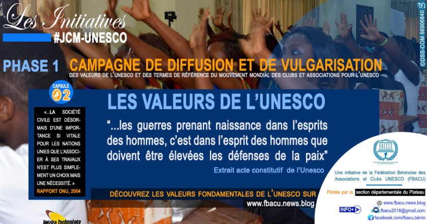 les initiatives JCM-UNESCO: c’est un programme d’information, un Bulletin hebdomadaire d’information du public sur l’Unesco. Il a pour but de vulgariser les contenus de références du mouvement international des clubs et associations pour l’unesco afin de favoriser la connaissance de ce mouvement aux uns et autres et multiplier les actions en faveur des idéaux de l’UNESCO. Une initiative de la Fédération Béninoise des Associations et Clubs Unesco, Pilotée par la section départementale du Plateau